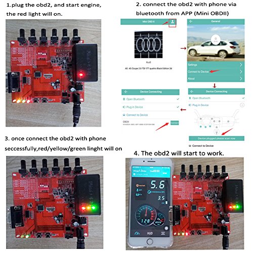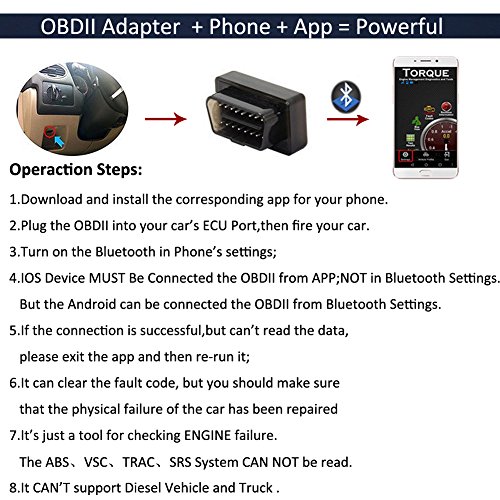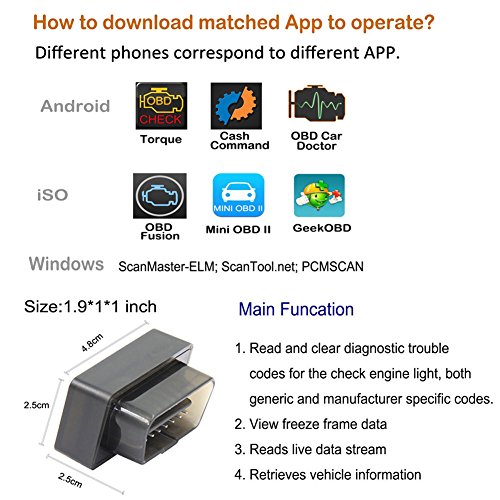 -. Feature : ✅ SUPERIOR COMPATIBILITY: Works on MOST 1996 and newer vehicles ,light trucks sold in the United States(OBD2), includes all Domestic, Asian and European vehicles. Supports OBD-II protocols:SAE J1850 PWM,SAE J1850 VPW,ISO 9141-2,ISO14230-4 KWP (5 baud init),ISO14230-4 KWP (fast init),ISO15765-4 CAN (11bit, 500 Kbaud),ISO15765-4 CAN (11bit, 250 Kbaud),ISO15765-4 CAN (29bit, 250 Kbaud),SAE J1939 CAN (29 bit, 250 Kbaud). / ✅ HIGH UNIVERSALITY: -Using Bluetooth 4.0 dual-mode design, perfectly support IOS, Android and Windows Device, unique obd2 bluetooth ios for iphone user. -Just need to connect OBD2 Scanner with your phone Bluetooth via our free app(PS: CONNNECTED BLUETOOTH FROM APP), and you can diagnose the ENGINE System and unlock massive amounts of data on your car's performance in real time. / ✅ SMART SCANNING: Read diagnostic trouble codes( both generic and manufacturer-specific),Clear trouble codes and turn off the MIL, Display current sensor data,including Engine RPM, Calculated Load Value, Coolant Temperature, Fuel System Status, Vehicle Speed, Short Term Fuel Trim, Long Term Fuel Trim, Intake Manifold Pressure, Timing advance, Intake Air Temperature, Oxygen sensor voltages/associated short term fuel trims, Fuel System status, Fuel Pressure. / ✅ Notice: ❶If you get the fault code ,you could search error on Google. ❷Please turn on your car when connecting, or the App cannot connect successfully. ❸It can clear the fault code, but only if the physical failure of the car must be repaired in advance. ❹The red light on is normal after the device is connected, it indicated that the device has been powered on and started to work. / ✅ Note: ❶The ABS、VSC、TRAC、SRS System CAN NOT be read; It can ONLY diagnose the fault of ENGINE System. ❷It CAN NOT support Diesel Vehicle, Electric Car and Truck. ❸You have to connect Bluetooth in the APP;NOT connect Bluetooth in your phone' s setting. ❹If it connected the Bluetooth successfully, but can't connected the car's ECU. Please check whether the device is stably inserted into the ECU detection port ,otherwise unplug it and re-connected.