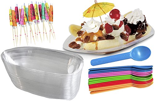 - Package of 16 clear plastic 12 oz. banana boats, 16 eco friendly plastic spoons and 16 paper umbrellas