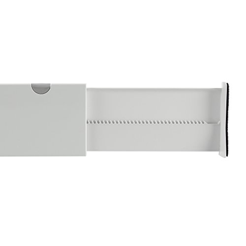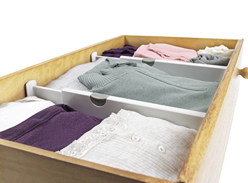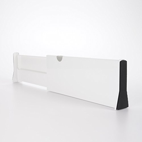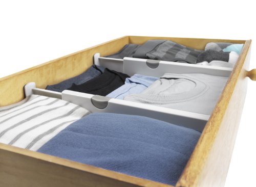 Take control of messy dresser drawers with the OXO Good Grips Expandable Drawer Dividers. This set includes two Dividers that are each 4-inch tall and expand from 11-inch to 17-inch to fit most drawers front to back or side to side. The mechanism is easy to use, extremely sturdy and does not require tools for installation. Just push down on the gray handle to secure the divider in place so it won’t budge, even if the drawer is opened and closed frequently. These Expandable Dividers are perfect for keeping socks and undergarments neatly separated from other items in the drawer, dividing drawers to fit baby and children’s clothing, organizing jewelry and many other uses. The Dividers can also be used in deeper kitchen or office drawers. Set/2
