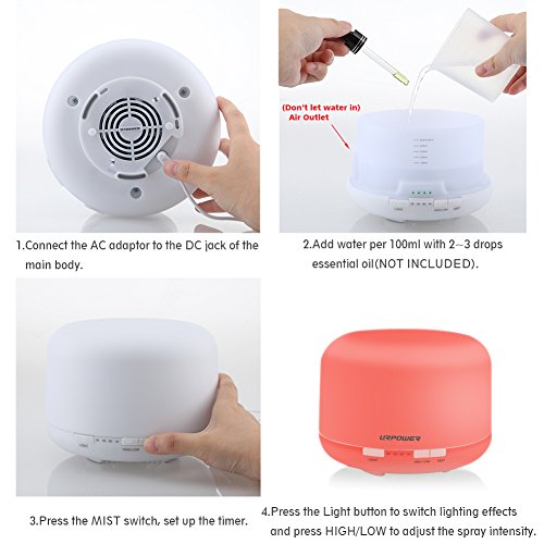 -. Title : URPOWER 500ml Aromatherapy Essential Oil Diffuser Ultrasonic Air Humidifier with 4 Timer Settings 7 LED Color Changing Lamps, 10 Hours Continous Mist Mode Running - AUTO shut off (100-240V)