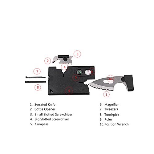 Serrated knife Bottle opener Big slotted screwdriver Small slotted screwdriver Compass Magnifier Tweezer Toothpick Ruler Position wrench