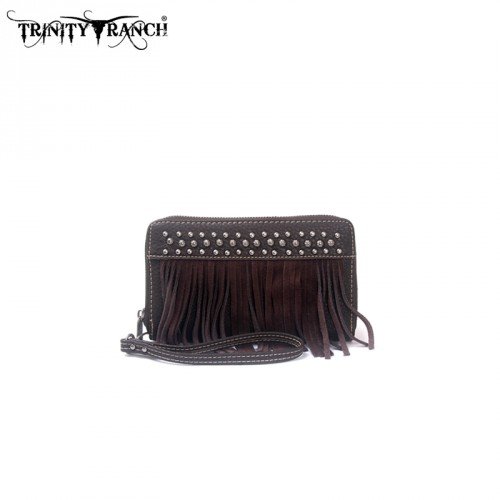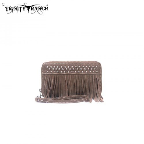 Product Description Trinity Ranch line by Montana West, this partial leather wallet has:, Genuine leather fringe on the front,Lacing with silver embellishments,A zipper enclosure for the entire wallet,Single compartment devided by a medium zipper pocket,Single removable strap to convert the wallet into a wristlet,Pockets on the inside for ID, credit cards, cash, and more,7.5 x 1 x 4, 0
