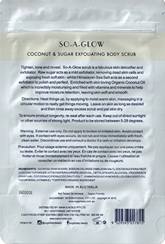 Tighten, tone and reveal. So-A-Glow sugar body scrub is a fabulous skin detoxifier and exfoliator. Raw sugar acts as a mild exfoliator, removing dead skin cells and exposing fresh soft skin while Himalayan Sea Salt acts as a second exfoliator to polish and perfect. Enriched with skin loving Organic Coconut Oil which is incredibly moisturizing and filled with vitamins and minerals to help improve moisture retention, leaving skin soft and smooth.