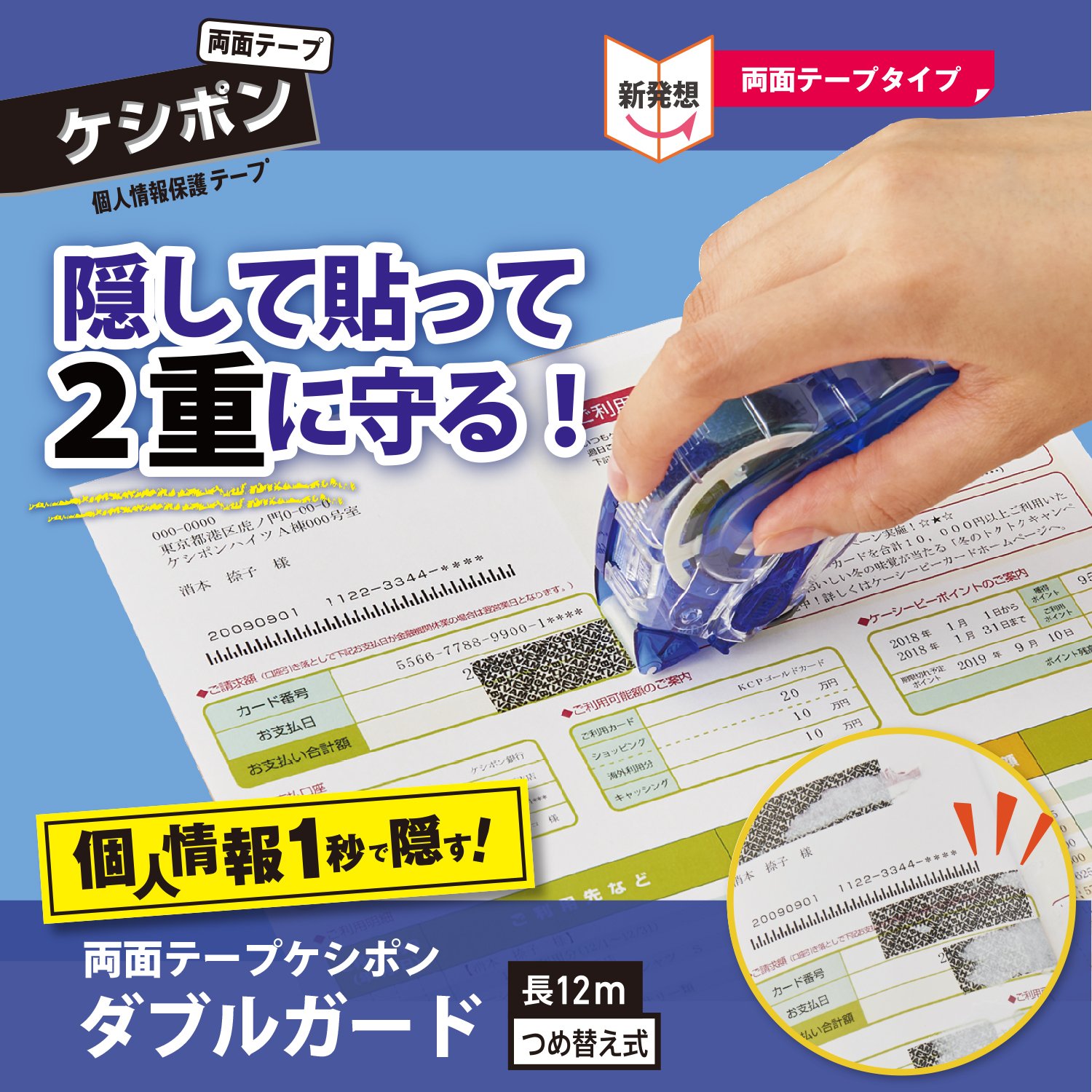強力な両面テープとケシポン柄で隠して貼って、ダブルガードでしっかり個人情報保護 規格 : 両面テープケシポン / テープ仕様 : 超強力にはるタイプ+ケシポン柄 外形寸法 : W100×D28×H60mm / テープ : 幅=15mm、長さ=12m / 使用回数 : 約200回 本体カラー : ブルー / 特殊アルファベットパターン : ブラック タイプ : テープ交換式 (つめ替え式) / 材質 : ABS
