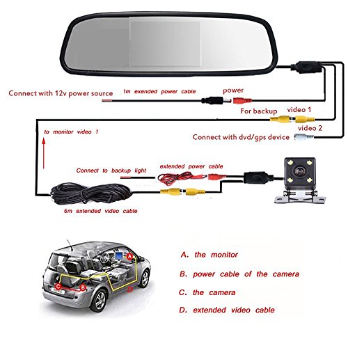 -. Feature : 4.3" TFT LCD Rearview Monitor. Anti-glare technology mirror design; High definition 480x272; Adjustable brightness, contrast. It covers your original rearview mirror. / Waterproof backup camera includes 4 IR led for Night vision. Distance Scale Line Display. Up to 170 degree lens. Adjustable angle stand. CMOS PC1030 color image sensor. Super mini size to keep your car original style. / Package includes all the necessary cables and wires to install your own rearview system. Extended 6 meters video cables and screws for set up. / Monitor with V1/ V2. V2 for backup view. Automatically switch to rear view system when reversing ,ensure to parking safely. V1 for dvd/ vcd/ tv/ gps. / Support PAL / NTSC. 6 meter RCA video cable. Applicable to variety of vehicles: car, mini-truck, mini-van etc vehicle length (12V working Voltage); perfectly solve the issue of bad car rear view effect ,can help reduce accidents. Please buy extra cable if the length of the package is not enough for you.