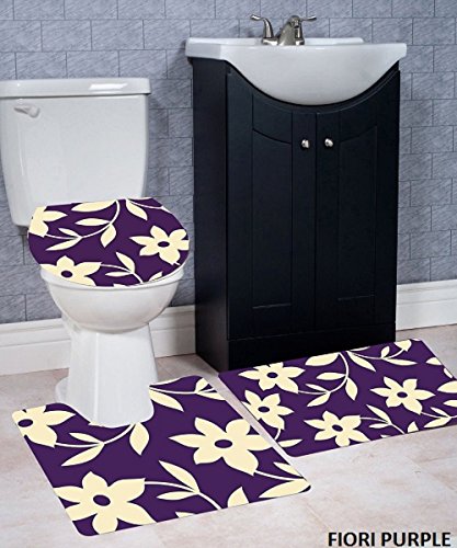 WPM 3 Piece Bath Rug Set FIORI Pattern Bathroom Rug (20"x32")/large Contour Mat (20"x20") with Lid Cover (Purple)
