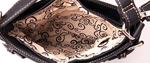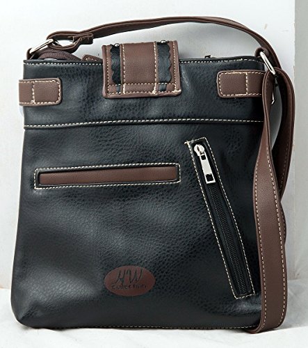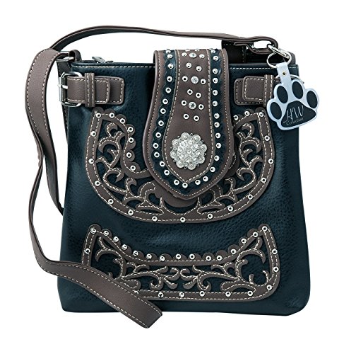 Product Description Western style crossbody messenger handbag is made from high quality premium PU faux/imitation leather decorated with scroll designs, silvertone hardware, western rhinestone floral concho on buckle that snaps closed magnetically on the front, and detachable HW Collection key ring/purse charm on the front. Spacious with its single compartment fabric lined interior, front wall that has 2 open pouch pockets and a zippered wall pocket on inside rear. Secure your possessions with its zip top closure. One discreet carry concealed zippered pocket on the back (8 inches long X 6 inches tall), HW Collection logo, and an open pocket that can fit a 5 inch phone. Crossbody or over the shoulder adjustable strap. Suitable for work, shopping, vacations, evenings out with friends or just to stand out and show off western bling style. 10 inches long X 11 inches tall X 1 inches wide. 0