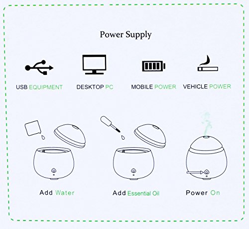 -. Feature : Diffuser: It fills the space with a lovely fragrance that can lift the mood and relieve stress from stressful and tired day, perfect for masking stubborn smoking and pet odors, get great and peaceful nights' sleep surrounded by the aromatic fragrance / Humidifier: Good stream of water steam to freshen the air to ensure your ability to breathe more comfortably / Quiet and Safe: Works in silence and shuts off automatically when water runs out. It is very safe to use the cool mist diffuser / Portable: 50ml essential oil can help you sterilization Purifying air for the kids room office bedroom, used a USB cable work / Helps Purify and Humidify the Air and improves the quality of the air we breathe. Unit may also be used as a non-aromatherapy humidifier. Provides moisture for Dry Cough, Sinus Irritation, Dry Skin