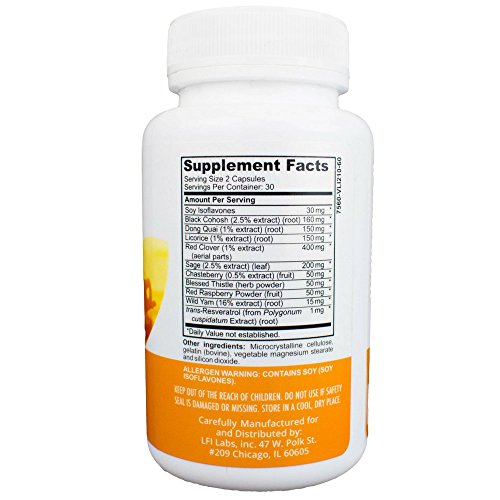 Studio : LFI Labs, inc Publisher : LFI Labs, inc Binding : Health and Beauty Product Description For women, menopause is a natural, yet notorious, process due to the host of symptoms it often causes. From cramps and fatigue to irritability and night sweats, pain and discomfort can make menopause unbearable. While you may not be able to stop menopause from occurring, you can soothe and reduce your symptoms! LFI Restore For Women utilizes natural precursors to estrogen like isoflavones Blessed Thistle to help relieve cramps, reduce heart palpitations, and ease irritability. Data make a convincing case that isoflavones can be of help to women who experience hot flashes and strengthen bones. Bone health-In response to declining estrogen levels, women can lose substantial amounts of bone mass in the decade following menopause, which markedly increases their fracture risk. Black cohosh was first used for medicinal purposes by Native American Indians, who introduced it to European colonists. Black cohosh became a popular treatment for women's health issues in Europe in the mid-1950s. Since that time, black cohosh has commonly been used to treat symptoms of menopause, premenstrual syndrome (PMS), painful menstruation, acne, weakened bones (osteoporosis), and for starting labor in pregnant women. Menopausal symptoms. Research shows that taking some black cohosh products can reduce some symptoms of menopause Other potent ingredients like Chasteberry, Licorice, and Dong Quai effectively aid in balancing hormones while reducing uncomfortable symptoms like hot flashes and night sweats. Add to that a boost of energy and sex drive from Wild Yam, and you'll feel like your old self again! These incredible results are thanks to an expert blend of herbs and extracts, specifically chosen because of their benefits to women's health. 0