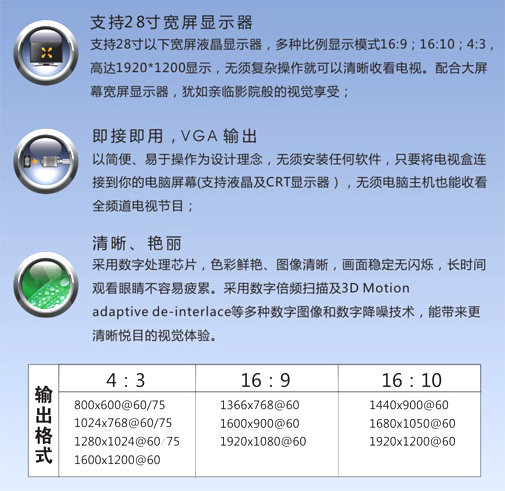 商品说明:VGA外置电视盒,支持29寸以下显示器,支持最高分辩率1920*1200,带内置喇叭,AV视频输入和遥控器,只要显示器分辨率符合要求,即使是42寸的液晶显示器也可以使用!