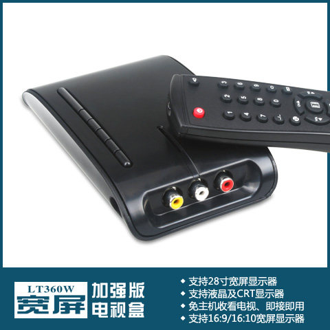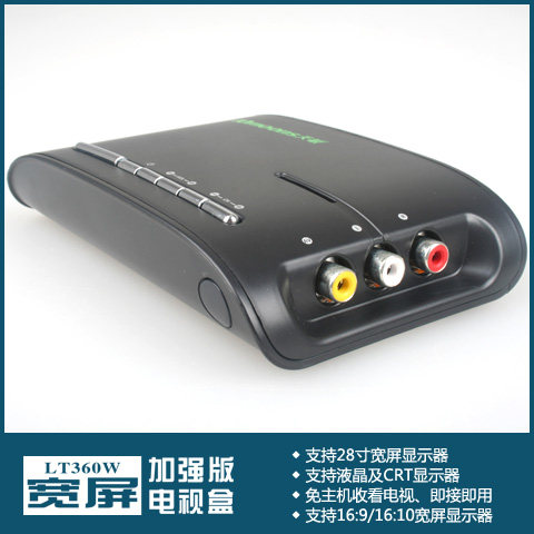 天敏宽屏加强版电视盒(LT360W)是一款免开主机便可收看电视的电视盒,动感时尚的设计外观。兼容各类AV、SV输入设备(DVD机/DV机/机顶盒 /摄像机)。支持28寸宽屏显示器,支持16:9、16:10、4:3多种比例显示模式,即接即用无须复杂操作就可以收看清晰的电视节目。可全面兼容 CRT和LCD显示器。