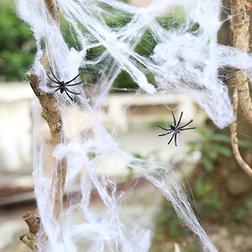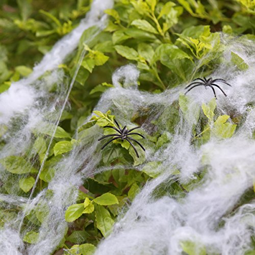 - Stretchable Spider Silk:Arbitrarily pulled,covered in any place you would like to cover,Halloween comes,such a realistic lightweight spider web fits every family.Spider silk has two black spiders on it.