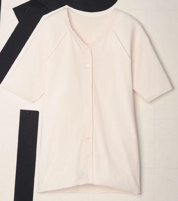 はだけ防止の為、2個の掛けボタンも付いています。縫い合わせを外側に向け、お肌にあたらないやさしい縫製です。 | |