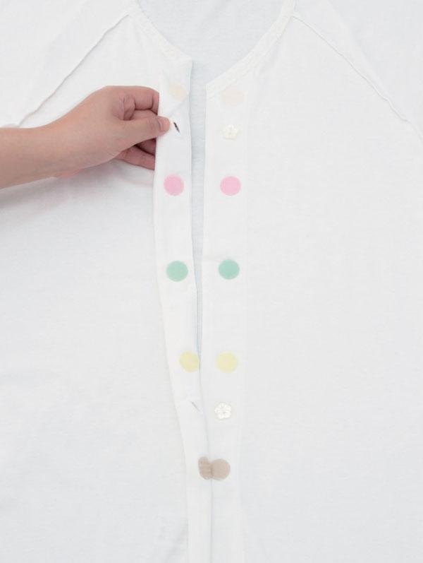 | はだけ防止の為、2個の掛けボタンも付いています。縫い合わせを外側に向け、お肌にあたらないやさしい縫製です。 |