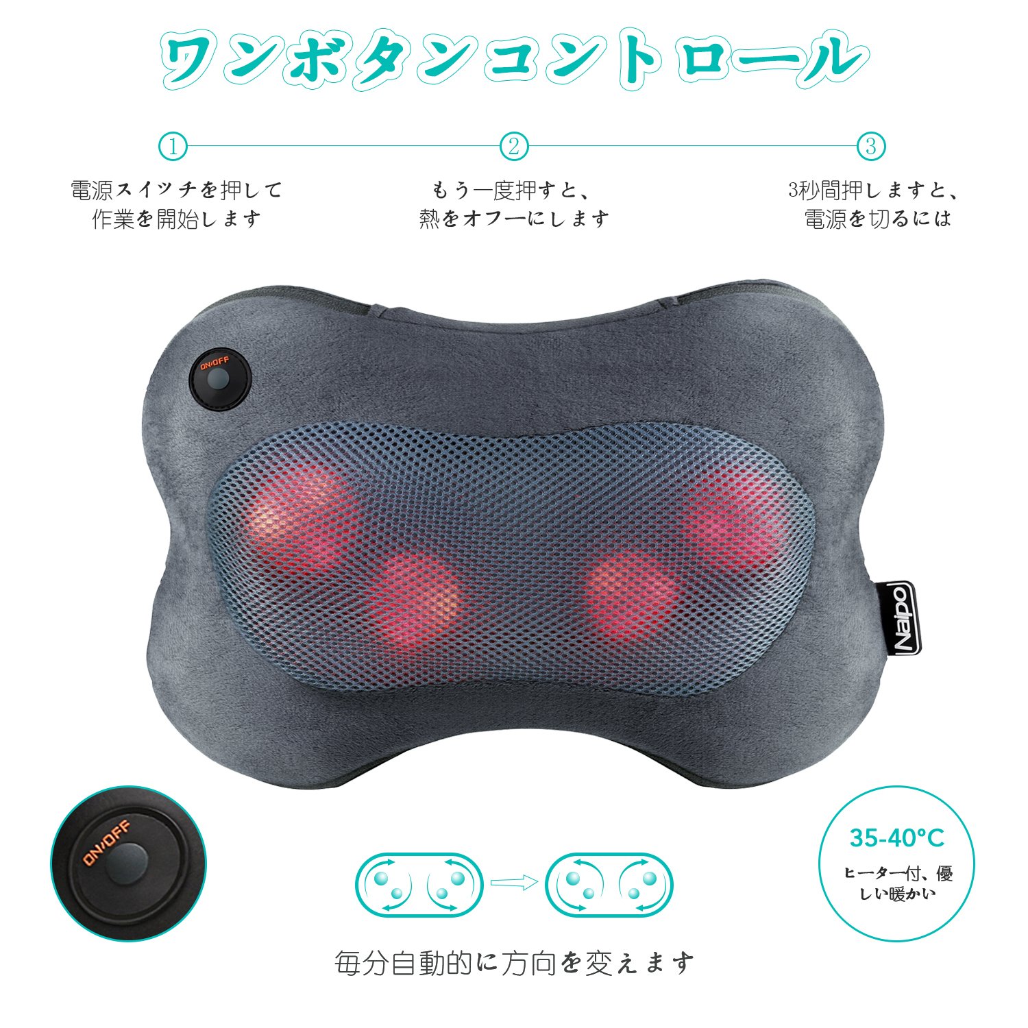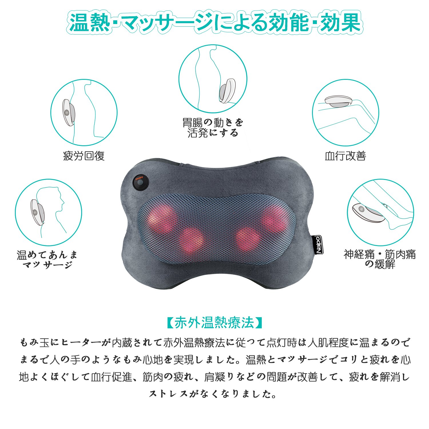 3【ヒーター機能付き】:もみ玉に内蔵した温感ヒーターが約44℃に加温し、血行促進、筋肉疲労の解消することができます。人の手のようなあたたかなもみ感でマッサージを行います。