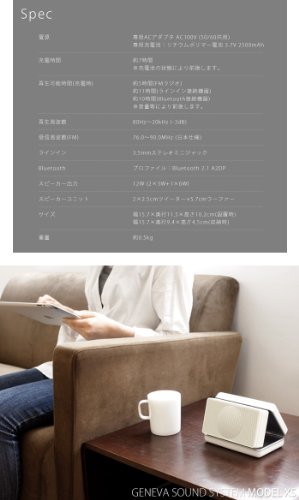 -. Feature : 【ブランド】GENEVA ジェネーバ 【サイズ】幅23.5×奥行18.5×高さ14.9cm 【重さ】約2.85kg / 【素材】ABS 【電源】本体:AC100V (50/60Hz) /リモコン:3V CR2032×1 【再生周波数】2.4GHz 【受信周波数(FM)】76.0~90.0MHz (日本仕様) / 【ラインイン】3.5mmステレオミニジャック 【Bluetooth】プロファイル:Bluetooth 2.1 A2DP 【スピーカー出力】15W×2 / 【スピーカーユニット】7.5cmフルレンジスピーカー×2 【機能】FMラジオ / アラーム機能付きデジタルクロック / タッチセンサーパネル / 【付属品】リモコン、電源ケーブル、FMアンテナ、専用スタンド 【保証期間】お買い上げから1年間