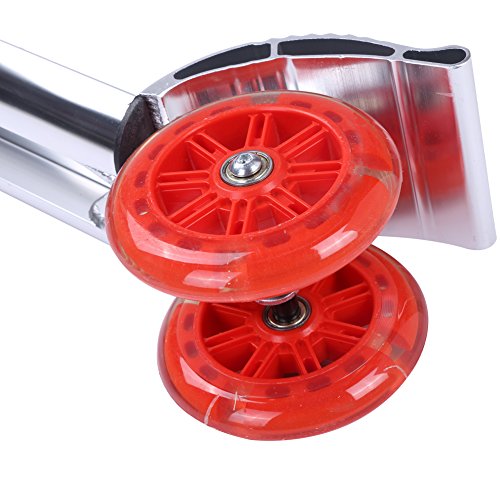 - Feature : Three adjustable height, suitable for people of different height and age / Durable full aluminum, anti-skid and waterproof pads on the surface of pedal. / Foot brake improvement, immediately stop when you step the brake, more safe and durable / 125 mm pu flash three-wheel, great stability. ABS handlebar, good touch and durable / Fixed device, easy to unfold and firmly fix, more safer. A small bell on the right, convenient for children remind the passerby.