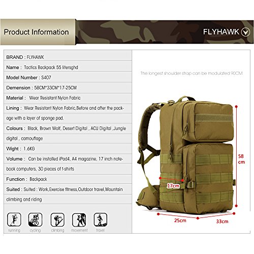 -. Title : FlyHawk 55 L Tactical Backpacks Large 3 Days Back Waterproof M0LLE Military Rucksack for Outdoor Hiking Camping Trekking Hunting Black