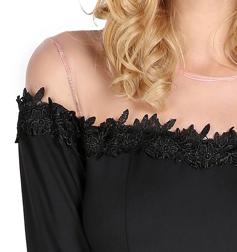 Fashionable sheer mesh shoulder and crochet lace design.