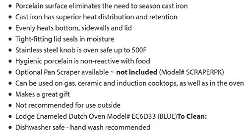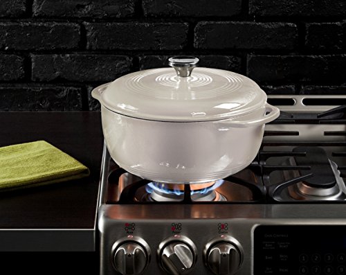 This 6-Quart enamel Dutch oven is great for cooking, marinating, refrigeration and freezing. The color porcelain enamel on cast iron can be used on gas, electric, ceramic and induction cooktops, as well as in the oven. Not recommended for use on outdoor grills or over open outdoor flames. Not for use in microwaves. Lodge Color Porcelain Enamel on Cast Iron cookware is cast from molten iron in individual sand molds. The porcelain surface eliminates the need to season cast iron. The cast iron vessel has superior heat distribution and retention, evenly heating bottom sidewalls and even the lid. Tightly fitting lid seals in moisture. The excellent heat retention reduces the amount of energy needed for cooking. Two layers of very hard, glossy porcelain enamel are chip resistant and easy to clean. Stainless steel lid knob is oven safe to 500 degrees Fahrenheit. The black rim on the pot is matte porcelain, not exposed cast iron. Hygienic porcelain enamel is non-reactive with food. Although dishwasher safe, hand washing with warm soapy water is recommended to preserve the cookware's original appearance. 10 3/4" diameter, 4 1/2" deep. Oyster White.Feature