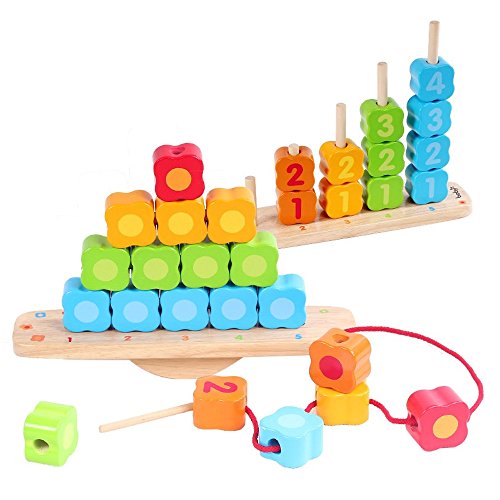 【Imagination and Have Fun】: Wooden balance blocks included 15 bead blocks, 5 sticks, 1 lacing, 1 base and 1 balance beam. Take challenge on stacking and balancing, develop child's counting skill, math skill
