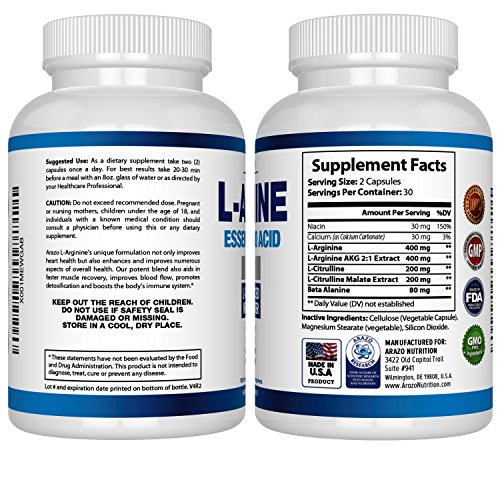 ★ PROMOTES LEAN MUSCLE - L Arginine is an essential amino acid that converts into Nitric Oxide, which relaxes blood vessels and boosts blood circulation. Expanded blood vessels pump more oxygen to your muscles, increasing your endurance!