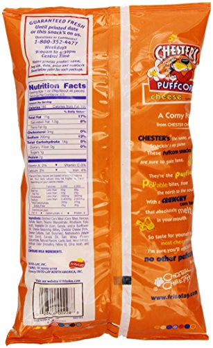 -. Feature : 4.5 oz. of CHESTER'S Cheddar Flavored Popcorn / Cheesy popcorn full of flavor / Great to pack and share as an on-the-go snack / Gluten free product