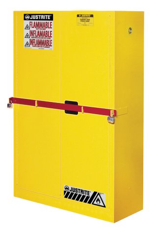 -. Title : High Security Flammables Safety Cabinet w/steel bar, Cap. 45 gals., 2 shelves, 2 m/c doors
