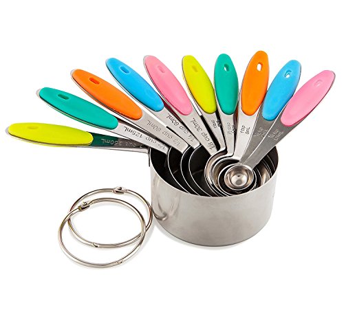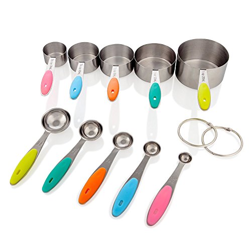10 Pcs Stainless Steel Measuring Cups and Spoons, Polished Stackable Set with Ring Holder and Engraved Volumes on Colorful Silicone Handles – Accurate Measurement for Cooking or Baking