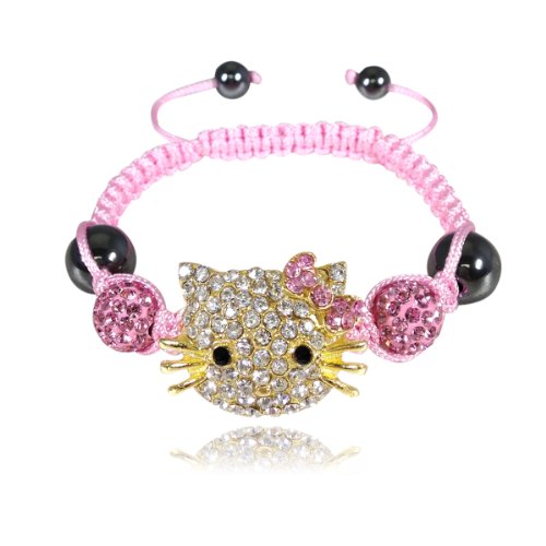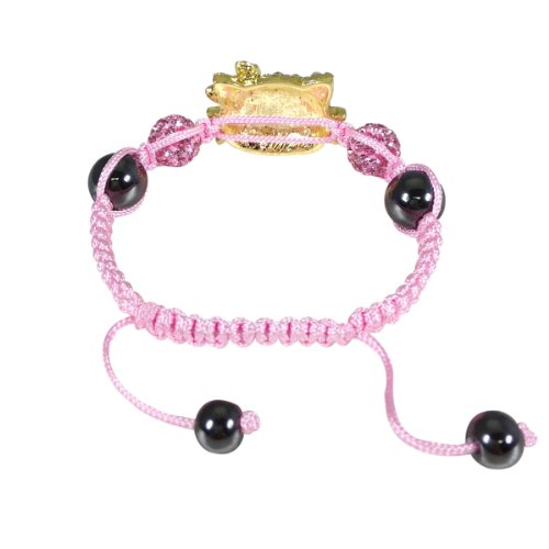 This shamballa inspired bracelet features Kitty's face and two 7mm highly polished hematite beads at the end. The design is simple yet eye-catching. The bracelet is adjustable and can fit arms of all sizes. Simply pull the cords to make the bracelet smaller, and the sides to expand the bracelet. Available in colors pink, white, black, beige or purple. Adjustable bracelet; can be worn by children and even adults! Pull the cords to reduce the circumference, and the sides to expand. Bracelet Circumference: minimum 5.25 inches, expanded 8.75 inches. Dimensions: Large beads 10mm diameter; Small beads 7mm diameter. Material: Crystal Rhinestones, Cord, Hematite Beads.Feature