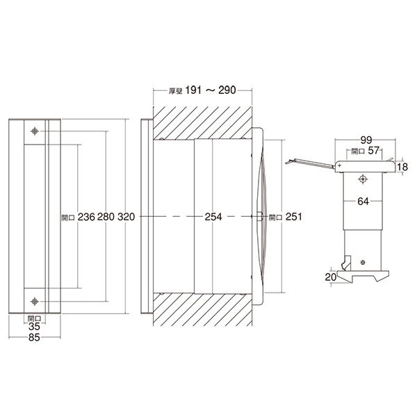 ●スペック:受口部:幅(mm)85 高さ(mm)320 取出し口開口寸法:幅(mm)57 高さ(mm)281 壁厚調整範囲191~290mm