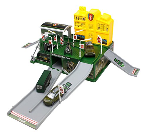 - Engineering army parking set includes brightly colored vehicles: 2 army training buses, chopper, commander chopper army jeep