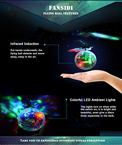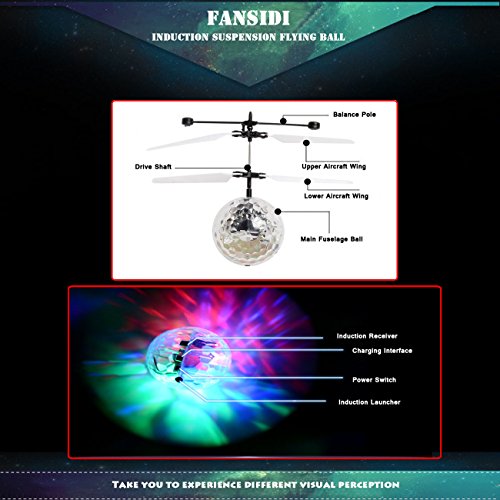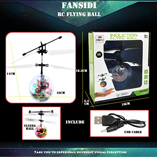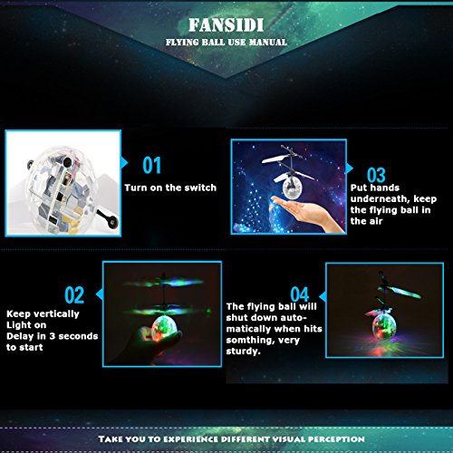 Studio : FANSIDI Publisher : FANSIDI Binding : Toy Product Description Fansidi RC Flying Ball - Your Best Christmas Gift Choice!!! HOW CAN I PLAY THE FLYING BALL? ① There's a small black on/off switch on the bottom, Slide switch on, and the dazzling LED light comes on. ② Hold the ball in a straight up position and wait for 2-3 seconds,then it will begin to fly. ③ The flying ball will keep up flying at 1-2 meters height, then go down slowly. put your hand, arm, leg, knee, (basically ANY solid surface!) underneath it for a short time (1-2 seconds) to make it go back up. ④ Fansidi Flying Ball can be controlled by the TV remote control or air conditioner remote control. You can start or stop the flying ball by turning on or off the TV remote control or air conditioner remote control. ⑤ Fansidi Flying Ball is operated by the bulit-in battery. It is rechargeable and can keep flying about 6-10mins. NOTE: Please keep our flying ball full charged before first use and stop playing when it is in low battery. ? The ball contains flashing LED lights and the shape of the ball reflects light perfectly providing an impressive light show, especially in a dark room. ? There may have a special flying sound while playing inside, but it's all right for this fun toy. SPECIFICATIONS: *Material: non-toxic ABS material, and electronic components *Color: Colorful *Lighting: LED light *Control: Induced by hand *Charge: USB charging cable *Package: Color Box *For ages: 8 years old or above, 3 to 7 years old children in parents escort. *Suitable place: Indoor PACKAGE LIST: 1* Flying Ball 1*USB Charging Cable WARNINGS: ☞Propeller rotating at high speed, the hands can not touch the propeller position, in order to avoid danger! ☞Keep it away from faces and eyes. ☞Do not launch it at people or animals. ☞While charging it, keep it from fire and water. 0