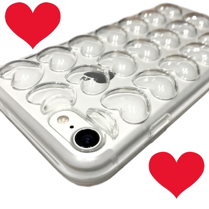 【対応機種】iPhone7 ( 4.7インチ )【デザイン】立体的なハートがいっぱい並んだ、とってもキュートかつおしゃれなデザイン。ストラップ付きなのでとても便利。適度にやわらかいソフトケースなので、よく手に馴染みます。※iPhone本体は付属しません。ケースのみとなります。可愛いのにおしゃれ。立体のハートがたくさん並んだソフトケースです。みんなからカワイイと言われること間違いなし!