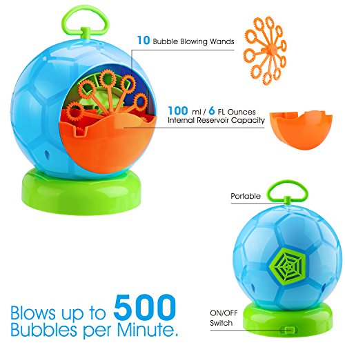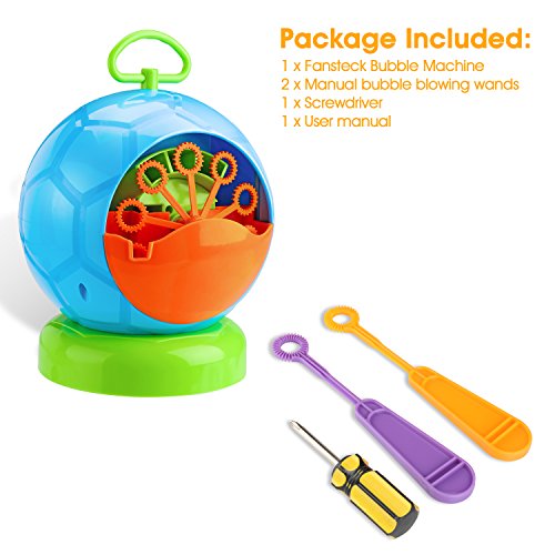 Studio : Fansteck Publisher : Fansteck Binding : Toy Product Description Fansteck-Funny Tech for Everybody! Fansteck Bubble Machine with automatic blowing motor and funny football shape is the perfect atmosphere lighter for parties and weddings, which is also a good gift for kids. It can create large number of colorful bubbles. Just press one key, the rotor soaked in bubble liquid will rotate in circle as the fan blows slowly, and then the bubbles will fly out right away. Take it, then just enjoy the fun of bubbles! Specifications: Tank Capacity: 100ml Size: 16x16x20cm Output: 500 per minute Quantity of Bubble Blowing Wands: 10 Easy Operation: 1. check the bubble machine during first use; 2. put the 4 AA Batteries into the bottom of machine; 3. pour moderate amounts of liquid into the reservoir; 4.turn the power switch to the "ON" to start the machine. Package Included: 1 x Fansteck Bubble Machine 2 x Manual bubble blowing bars 1 x Screwdriver 1 x User manual After-sales Service: At Fansteck, we believe our products. This device comes with our 18-month warranty and friendly customer service. Notes: 1.Please keep the air intake ports free from blockage; 2.Do not use outdoors in the rainy day for preventing from a short circuit; 3.The quantity of bubble is also depend on the type of bubble liquid. 0
