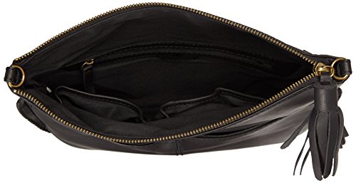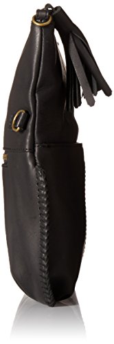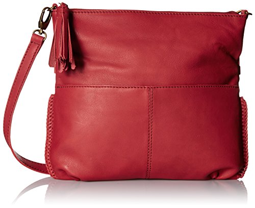 Cross-body handbag featuring braided side seams and foldover zippered top with tassel pull