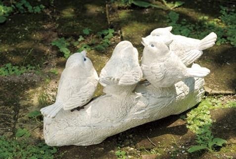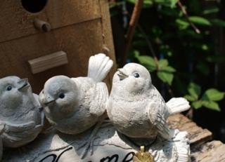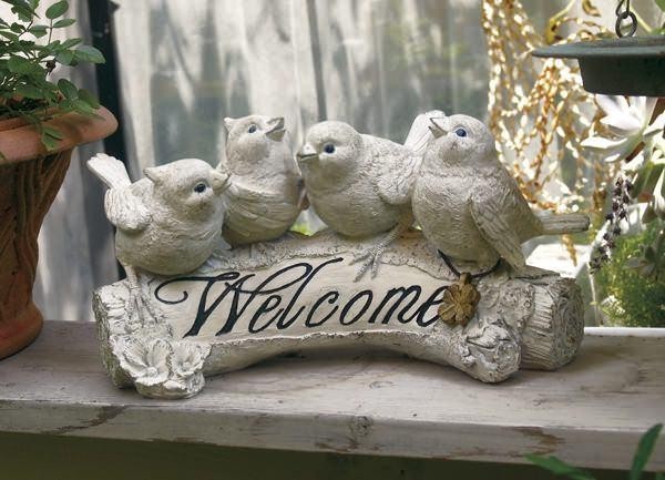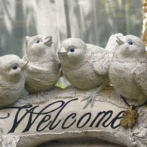 | 楽しげにさえずる、4羽の小鳥達。とまり木にはwelcomeの文字が入っています。美しい歌声が聞こえてきそうなオーナメントは玄関に置くのもオススメです♪アンティーク感が可愛いクローバーチャームがついています。 |