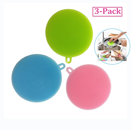 Billmill Dishwashing Brush Silicone Round Wash Bowl Sponge Scrubber Towel Kitchen Cleaning Antibacterial Multifunction Tool for Dish, Fruit and Vegetable, Heat-resistant Mat (3, MIX)