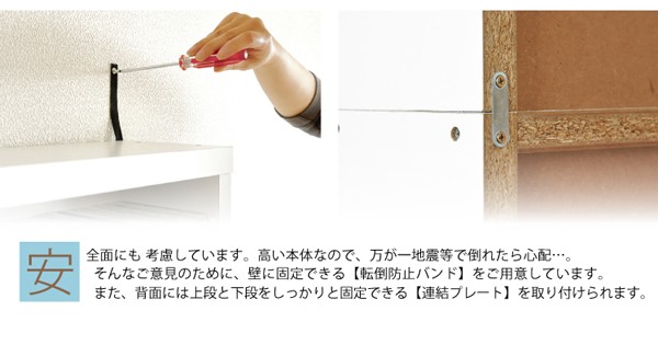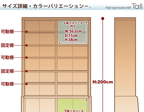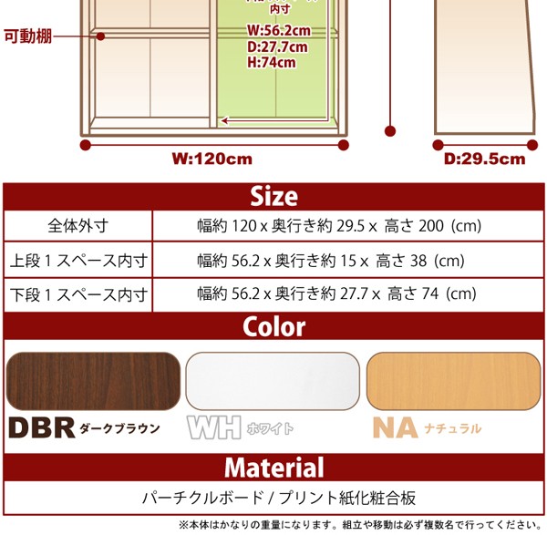 【商品について】■本体:幅約120x奥行約29.5x高さ約200■内寸:(上段1スペース内寸)幅約56.2x奥行き約15x高さ約38 (cm)(下段1スペース内寸)幅約56.2x奥行き約27.7x高さ約74 (cm)※可動棚上下合わせて8枚付き■構造部材:パーチクルボード/MDF/プリント式化粧合板マレーシア製■カラー:ナチュラル・ダークブラン・ホワイト ※メーカー直送品、商品代引き不可