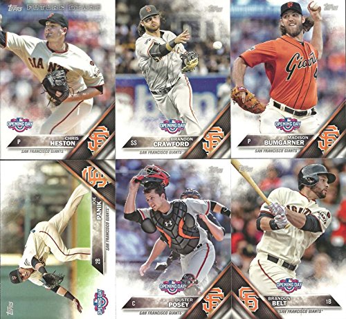 [Product Information]- This is a San Francisco Giants 2016 Topps OPENING DAY MLB Baseball series complete mint 6 card team set; it was never issued in factory form. Players included are Buster Posey, Madison Bumgarner, Brandon Crawford, Brandon Belt, Chris Heston and Joe Panik.