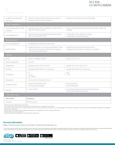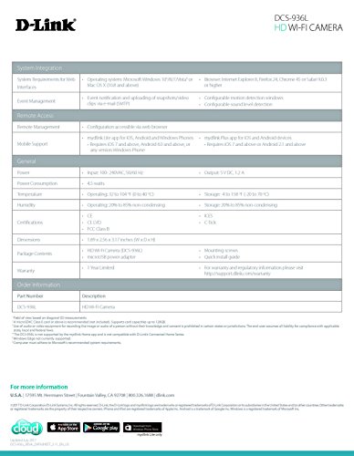 The HD Wi-Fi Camera (DCS-936L) provides crisp 720p video, making it easy and convenient to watch over your home no matter where you are. 16 feet of night vision allows you to see in total darkness and with automatic push alert notifications whenever sound or motion is detected, you’ll never miss a moment. The DCS-936L features a Wi-Fi signal locator LED which helps you determine optimum Wi-Fi connection when deciding where to place your camera. Use your mobile device with the mydlink Lite app to stream live HD 720p video or record to a microSDXC card up to 128 GBs.