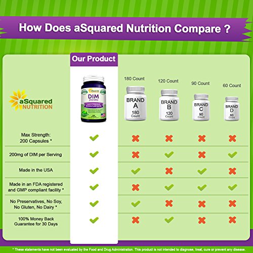 -. Feature : MAX STRENGTH DIM: aSquared Nutrition's maximum strength DIM (Diindolylmethane) formula contains 200mg of pure DIM per serving. With 200 capsules in every bottle, you receive a full 100 day supply. DIM is a phytonutrient derived from eating indole-3-carbinol, which is naturally found in cruciferous vegetables including kale, cabbage & broccoli. DIM is a powerful antioxidant that is often taken to help relieve symp associated with menopause in women, such as hot flashes and night sweats. * / FEEL THE DIFFERENCE: DIM (also known as Diindolylmethane) is an antioxidant that contains anti-inflammatory properties. DIM supports balanced estrogen hormone levels, may help reduce hot flashes & night sweats, supports estrogen metabolism & increased fat burning, supports immune system health, and promotes mental clarity & stability. DIM is thought to be an Aromatase Inhibitor, and is often taken with DHEA 100mg pills or Turmeric Curcumin (with BioPerine). * / RELIEVE MENOPAUSE SYMP: DIM is often taken to help relieve symp of menopause in women including hot flashes and night sweats. DIM helps maintain natural hormone balance by helping the body metabolize excess estrogen. DIM also helps restore energy levels and supports increased fat burning. DIM is thought to be an Aromatase Inhibitor (AI), as it helps suppress aromatase activity. DIM is also often taken by men to help protect against free testosterone depletion. * / NATURAL & MADE IN THE USA: aSquared Nutrition's potent DIM supplement contains 200mg of pure DIM per serving (2 capsules). Our natural formula is made from pure DIM, and does NOT contain preservatives, soy, gluten, dairy or extraneous fillers. Our complex is made in the USA, in an FDA registered and GMP compliant facility. Our products go through rigorous testing to ensure quality & purity. Both men and women can take our formula. * / BEST VALUE ON AMAZON: Our maximum strength DIM 200 MG supplement is backed by our 100% Money Back Guarantee for 30 days. DIM is often taken to help relieve symp of menopause. DIM (Diindolyl-Methane) comes in many forms including capsules, pills, softgels, tablets, powder and cream. Try also our vegetarian Turmeric Curcumin (with BioPerine), CoQ10 400mg, DHEA 100 MG, Resveratrol, Quercetin 500mg, and natural Milk Thistle 1000mg. *