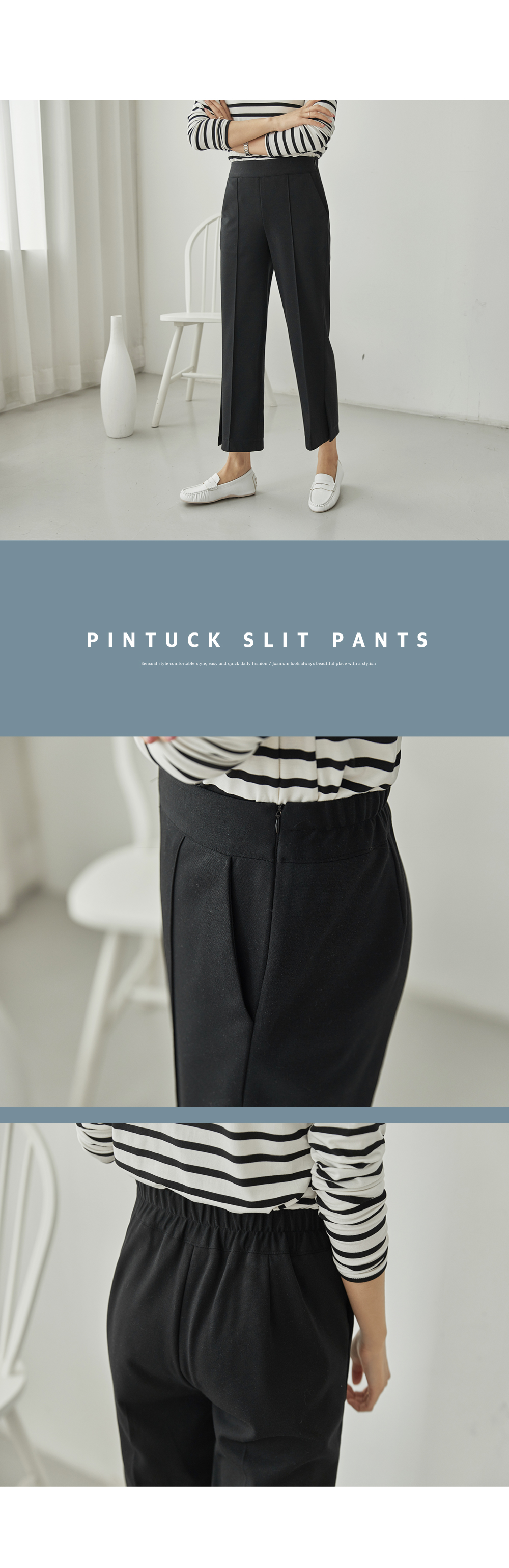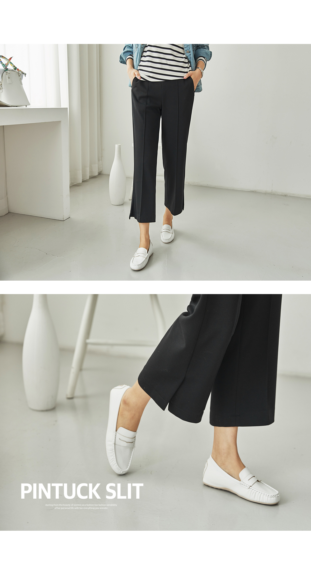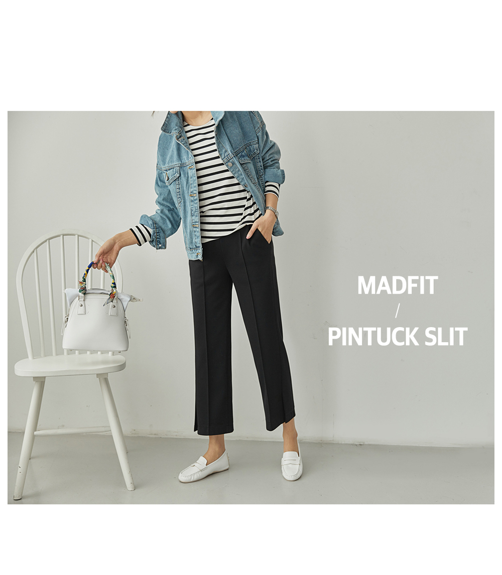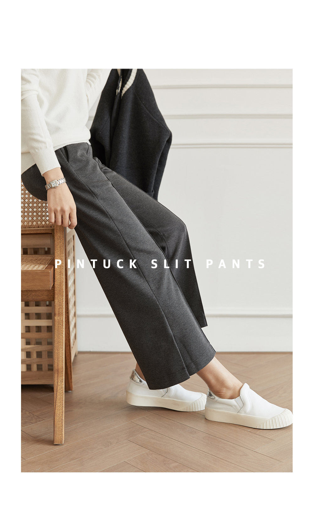 フラップをたてるだけのワイドはNO! ピンタックラインで足が長く見え スリムに見えるように演出することができ 膝出るまで防ぐことができるという点! また、裾スリットディテールに もう一度 足首のラインを開けきれいに整えてくれますよ。