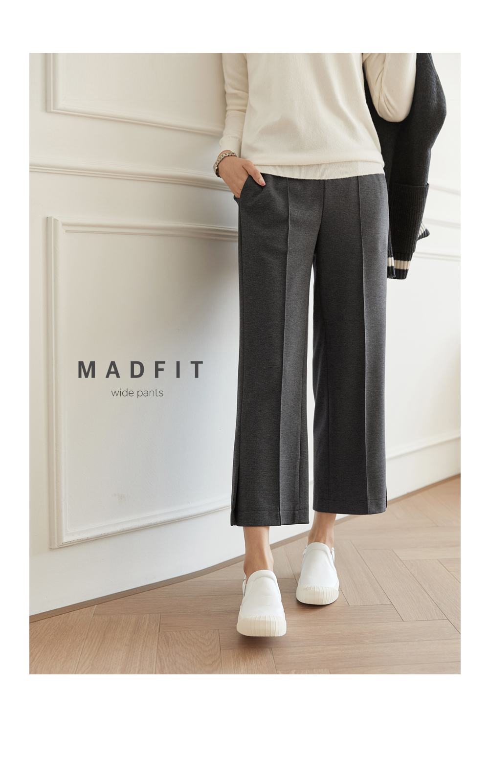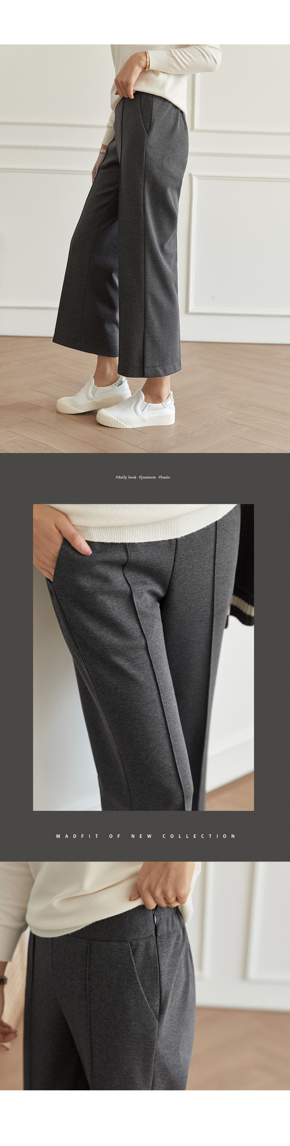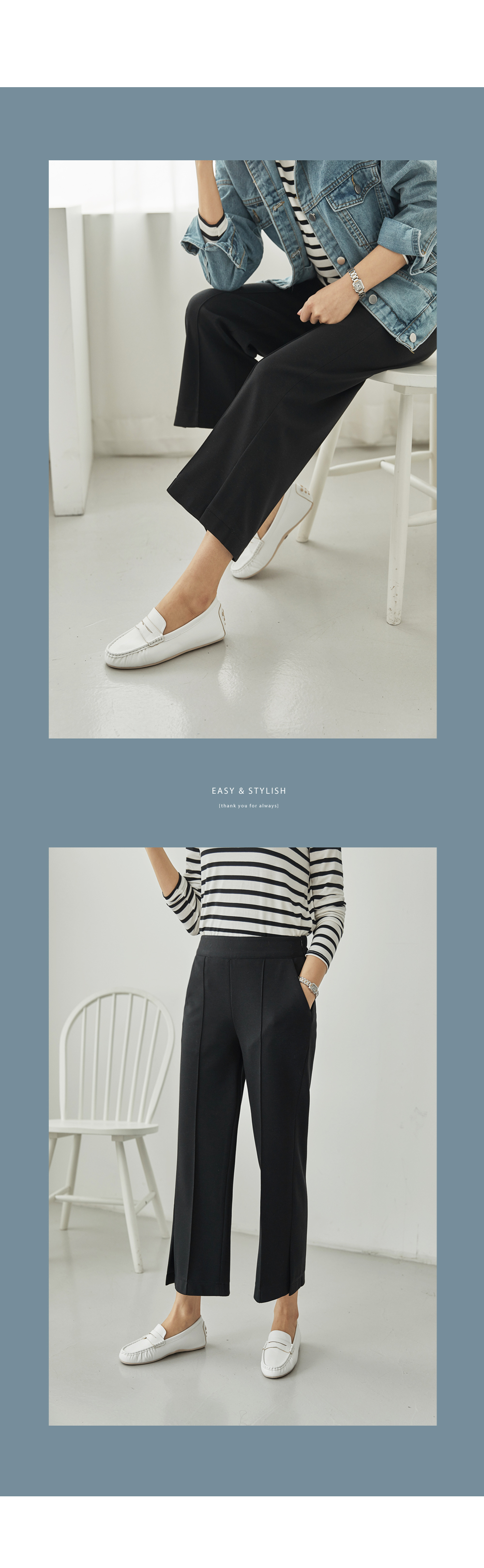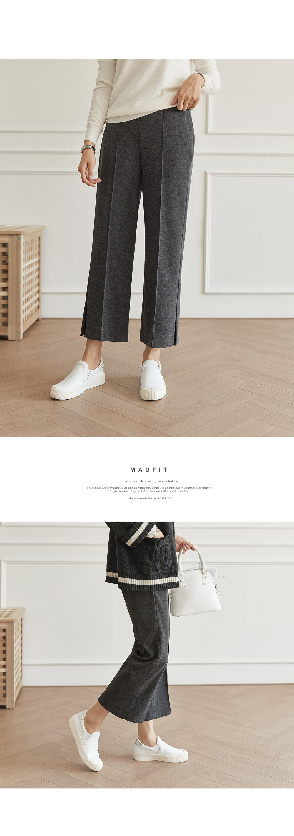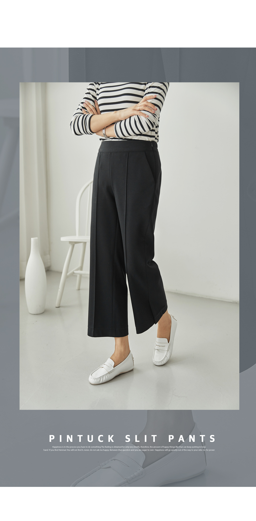 フラップをたてるだけのワイドはNO! ピンタックラインで足が長く見え スリムに見えるように演出することができ 膝出るまで防ぐことができるという点! また、裾スリットディテールに もう一度 足首のラインを開けきれいに整えてくれますよ。