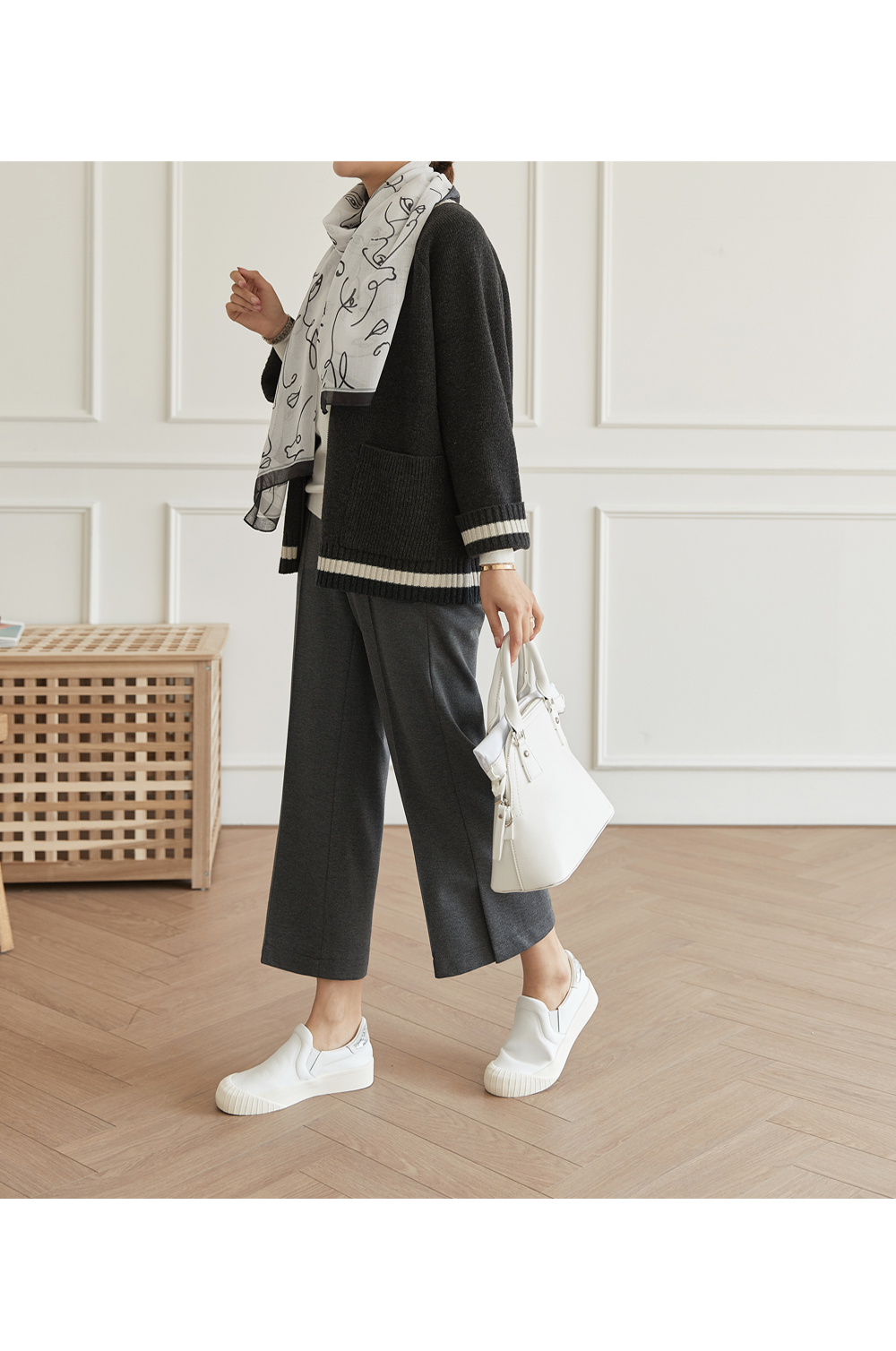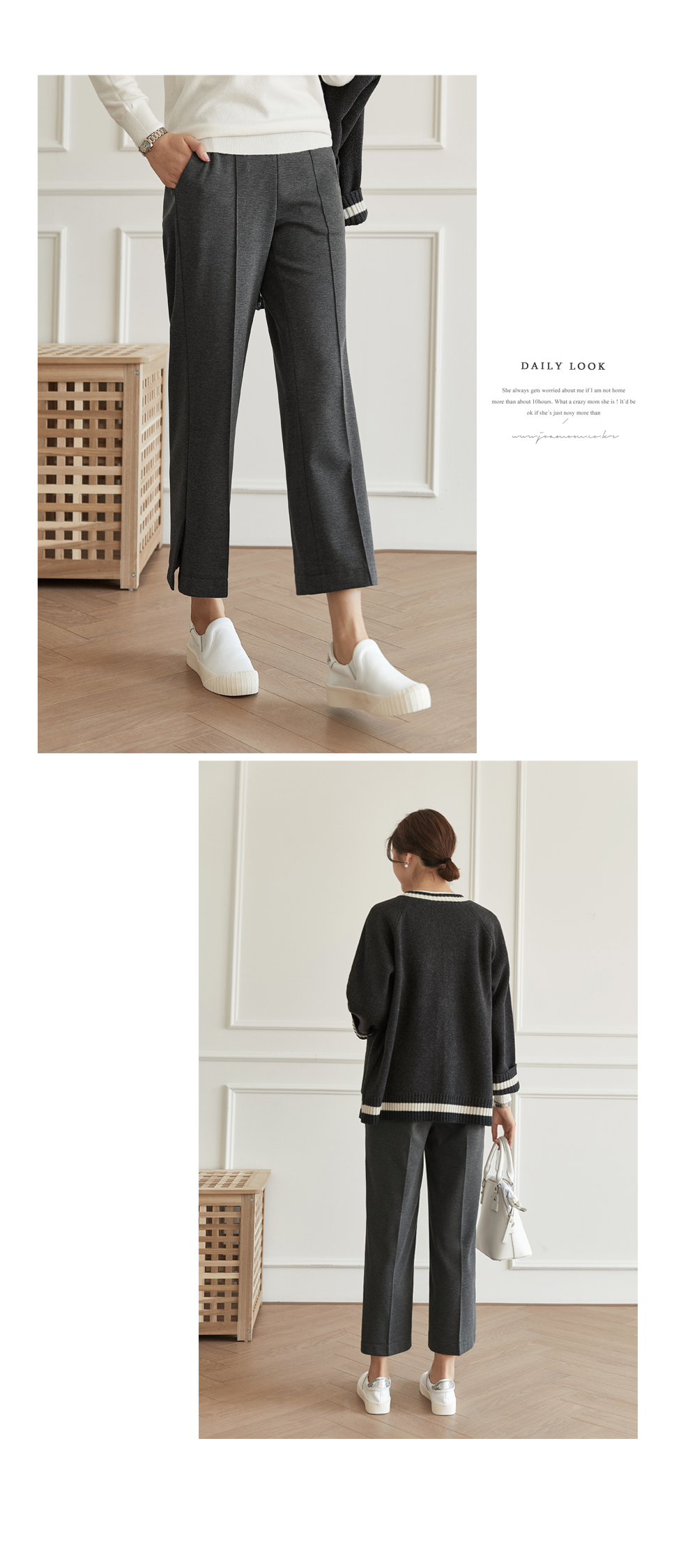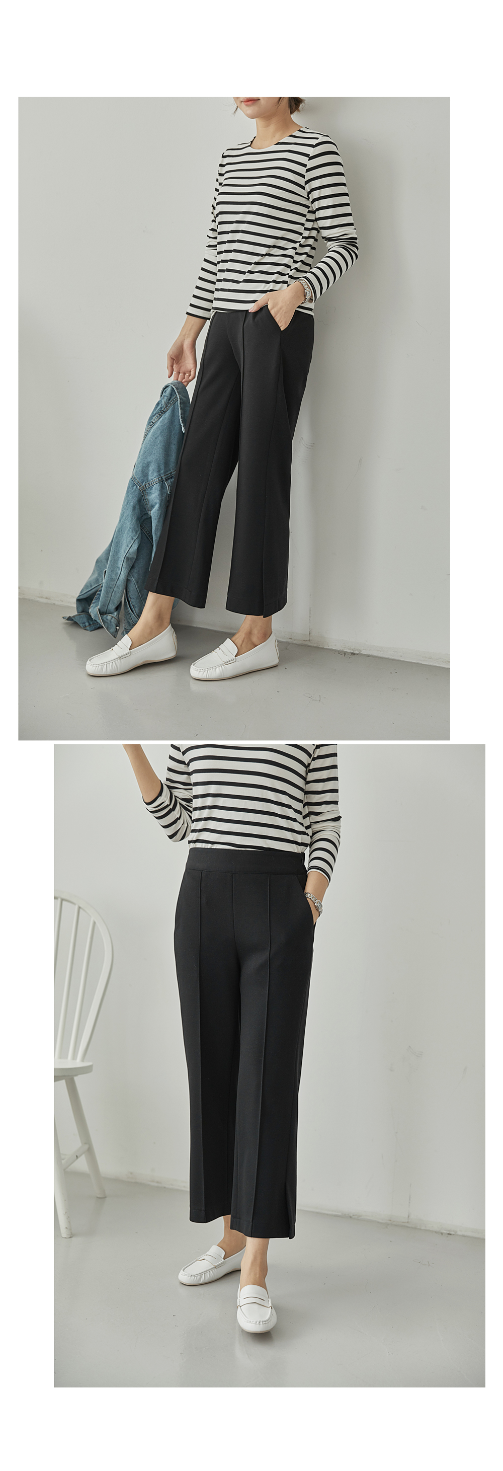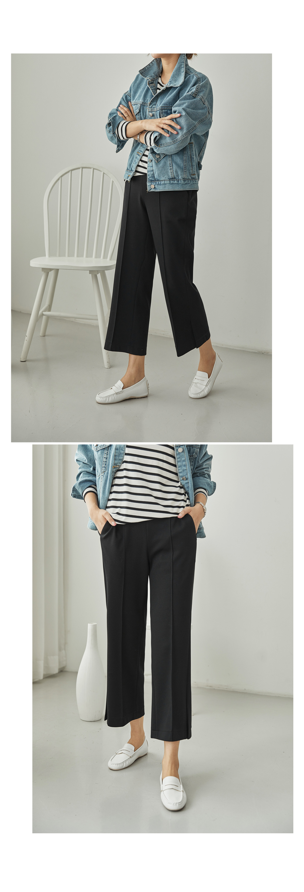 フラップをたてるだけのワイドはNO! ピンタックラインで足が長く見え スリムに見えるように演出することができ 膝出るまで防ぐことができるという点! また、裾スリットディテールに もう一度 足首のラインを開けきれいに整えてくれますよ。