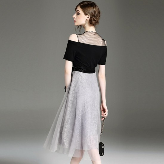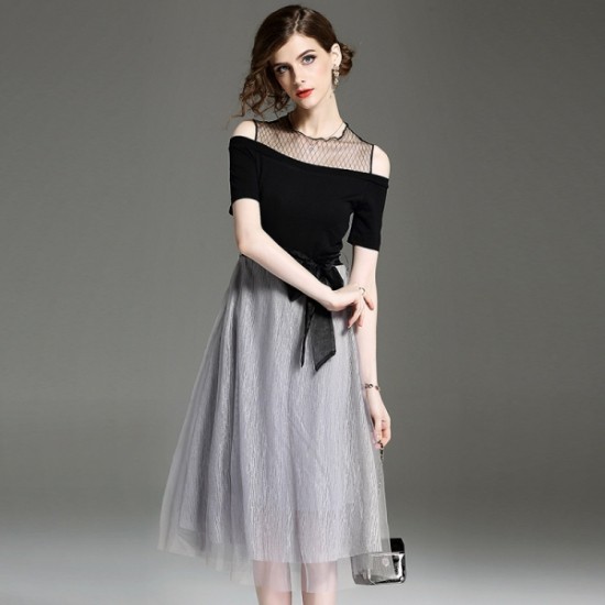 パーティードレス ミモレ丈 ワンピース モノトーン バイカラー オフショルダー シック エレガント 大人 上品 お呼ばれ drgz2587