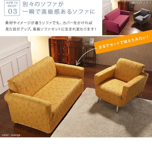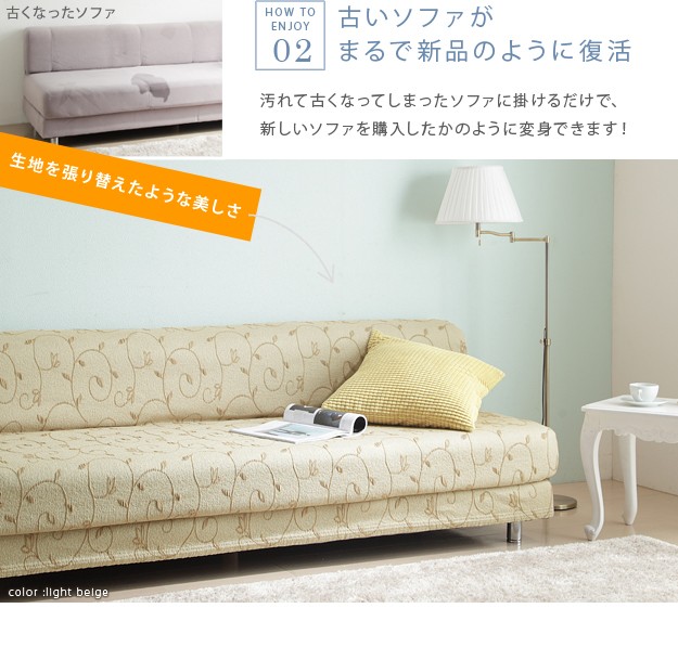 商品について:ジャガード織りの高級感あるスペイン製のソファカバー。横方向のストレッチ生地で高いフィット感です。控えめな草花柄がすっきりとした印象です。