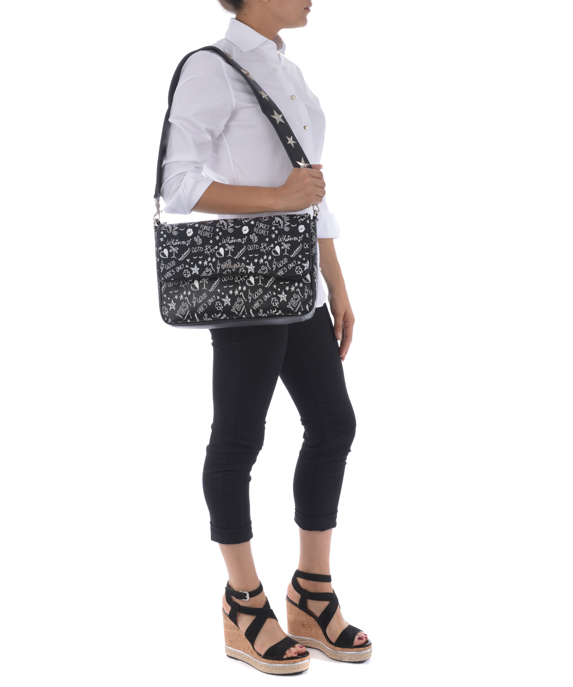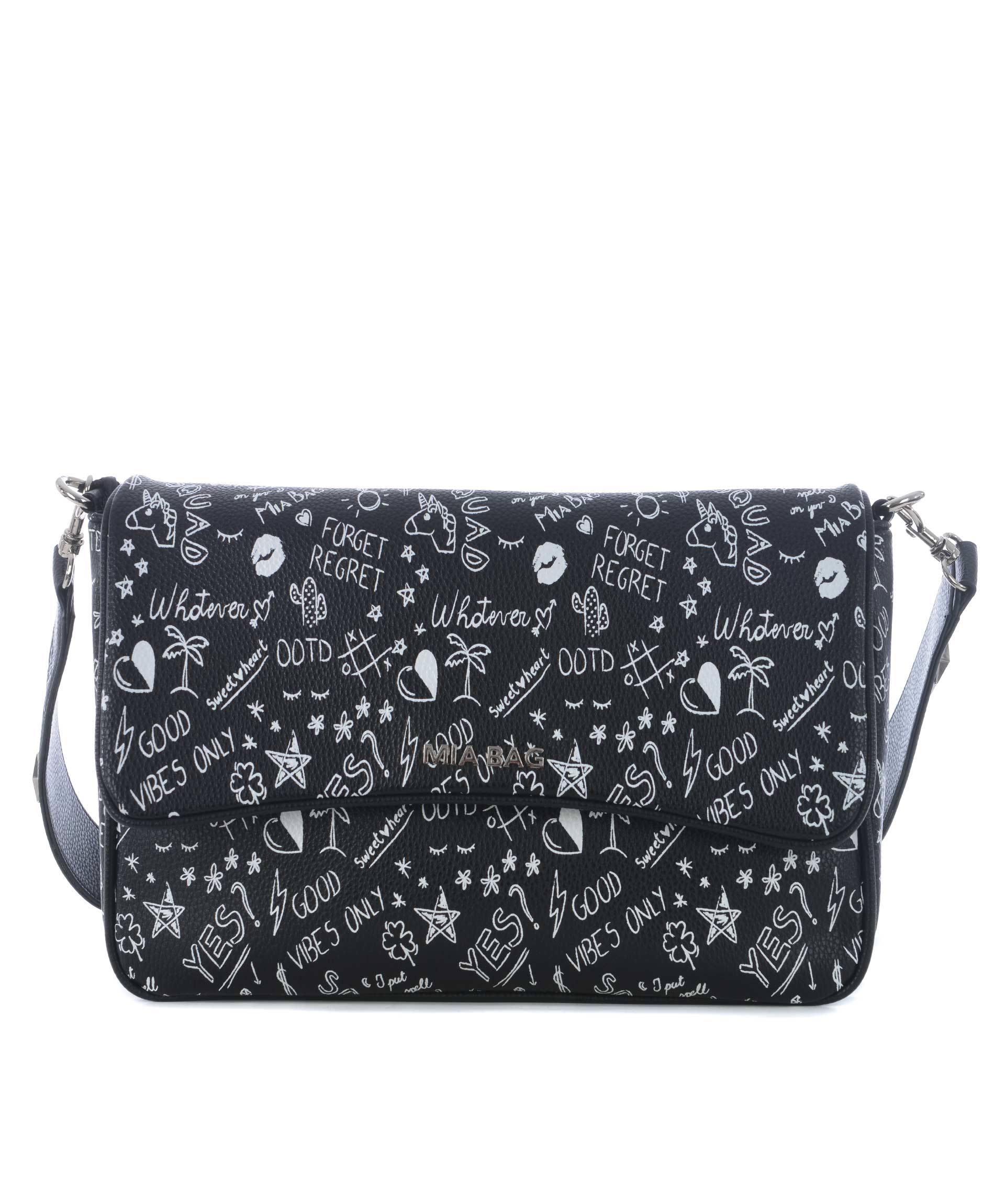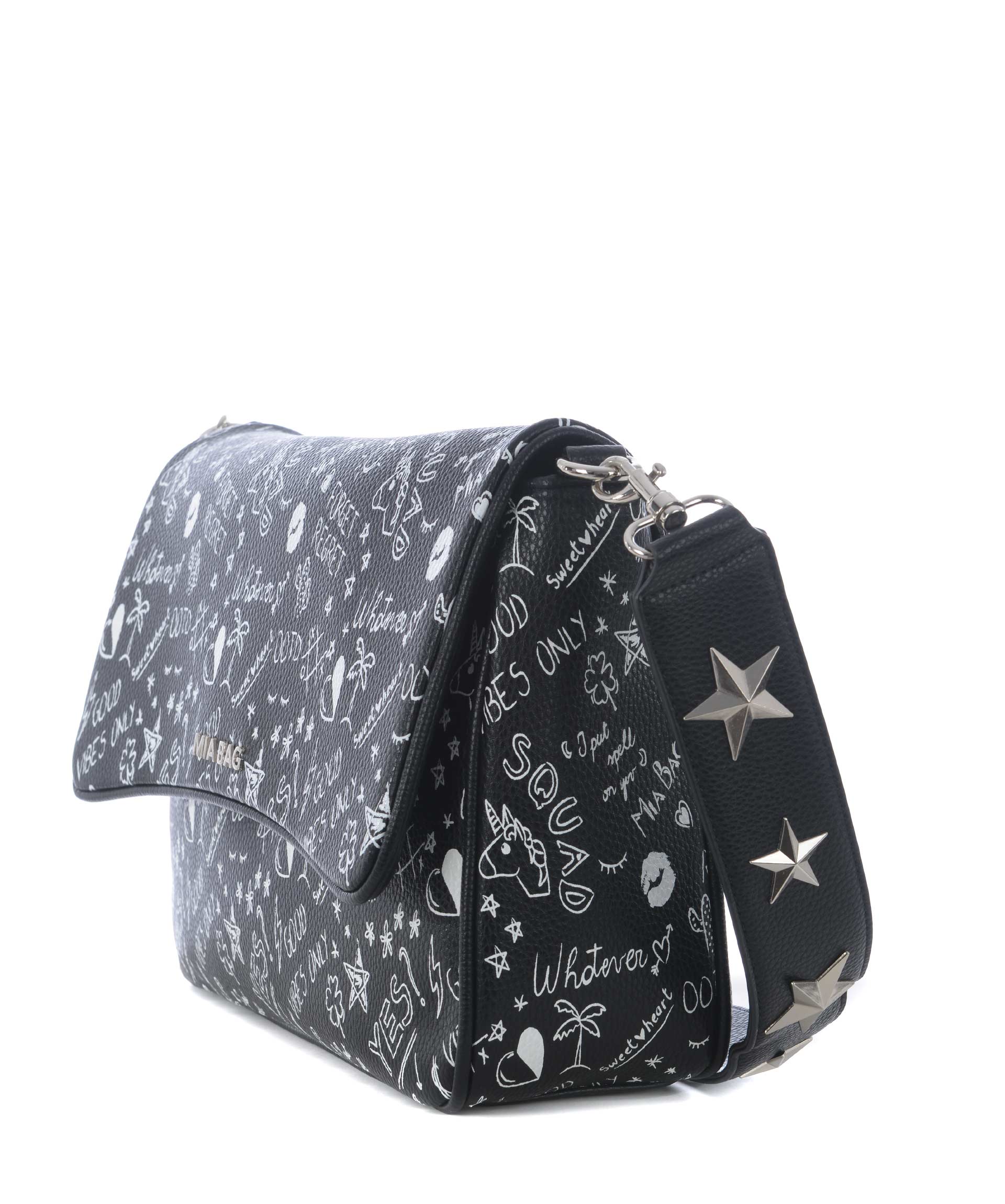Borsa Mia Bag in ecopelle Nera. Stampa graffiti su tutta la superficie. Logo frontale in metallo argentato. Manico in ecopelle removibile decorato con stelle in metallo. Patta frontale con apertura ad incastro. All'interno tasche applicate, tasca con zip. Fodera logata. Rifiniture in metallo dorato.
