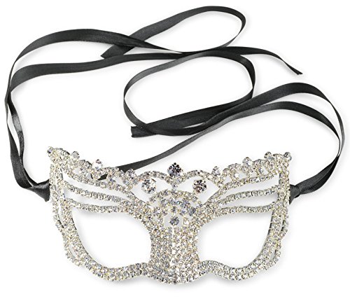 -. Feature : Women's silver tone rhinestone encrusted masquerade mask / Dazzling clear rhinestones cover the mask / Adjustable black satin ribbon ties / Perfect for New Years - Carnival - Mardi Gras - Prom or Masquerade party