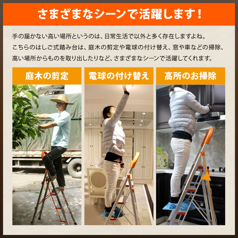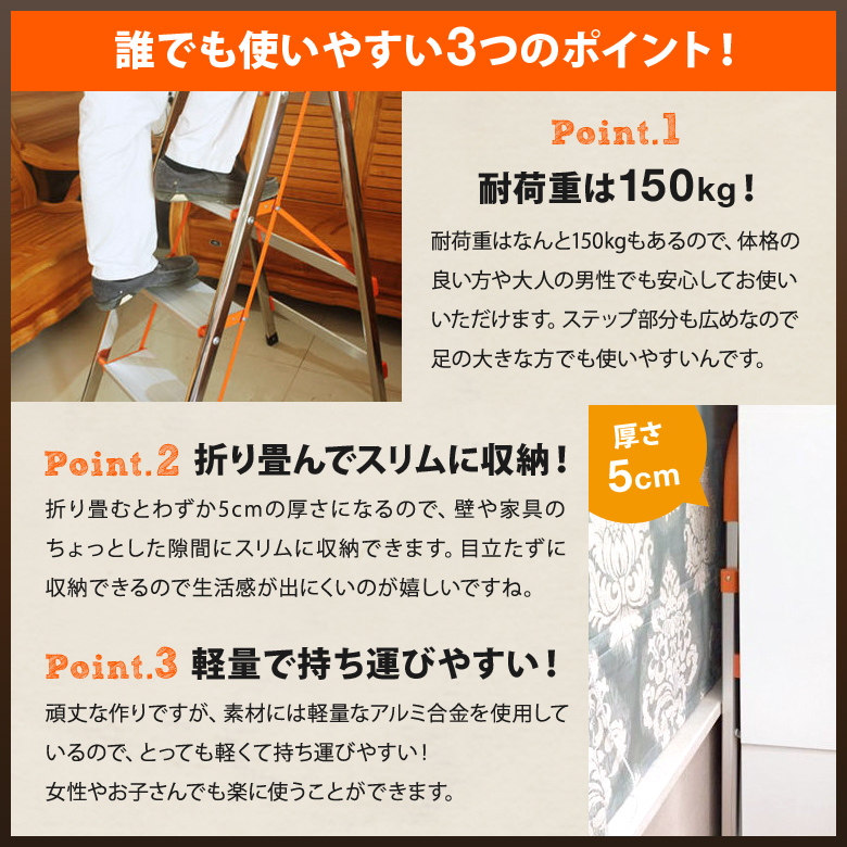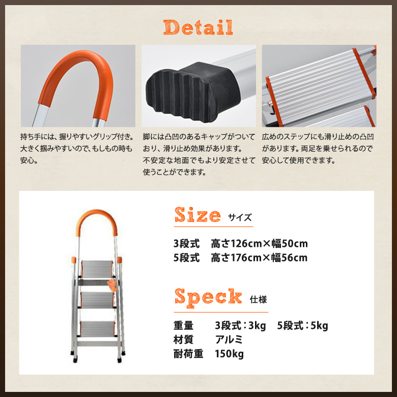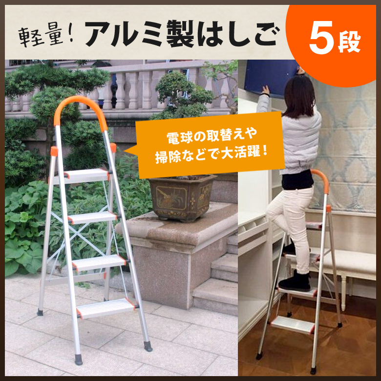 ●商品名 アルミ製はしご ●商品詳細 ・サイズ 5段サイズ:高さ176×幅56 3段サイズ:高さ120×幅50 ・重量 5段サイズ:5㎏ 3段サイズ:3㎏ ・材質 アルミ ・耐荷重 150㎏ ●Pick Up ・耐荷重は150㎏!大き目な方でも安心してご利用頂けます ・しっかりした作りですが軽量なので女性でも持ち運び楽々 ・折り畳んで収納可能!収納時には厚さ5㎝とコンパクト ・広々ステップで両足を乗せられ安定性抜群